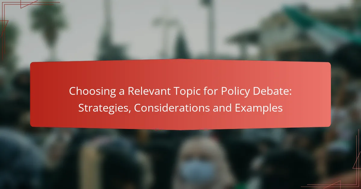 Choosing a relevant topic for policy debate involves identifying pressing issues, gauging public interest, and ensuring the feasibility of discussion. Effective strategies include engaging with stakeholders and reviewing historical debates to inform your choices.
